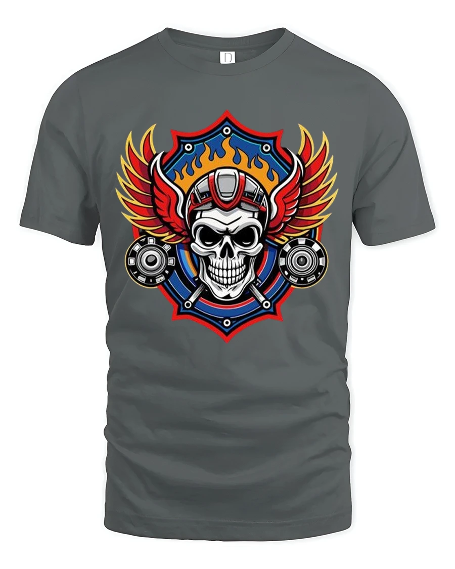 The Winged Biker Skull Pistons Flame Emblem Graphic T-Shirt Tee also makes a great gift for motorcycle enthusiasts, club members, and fans of skull or biker-themed art. Ride with attitude and standout style in this bold graphic tee.