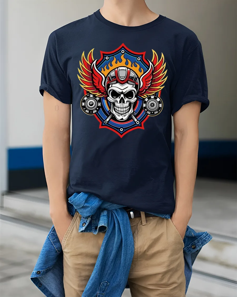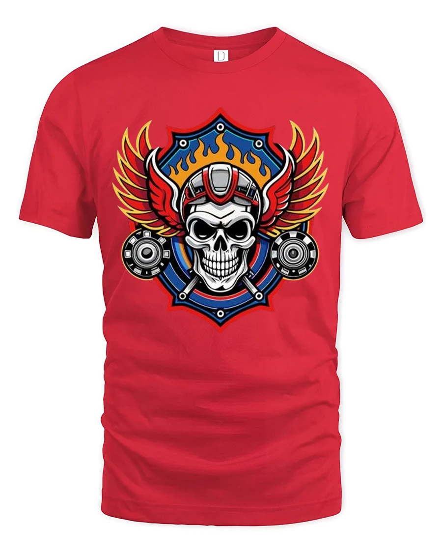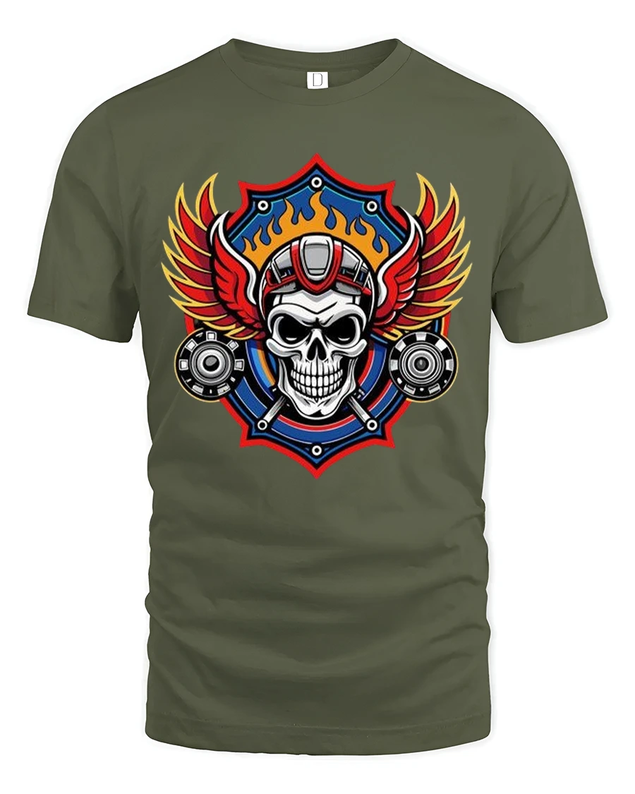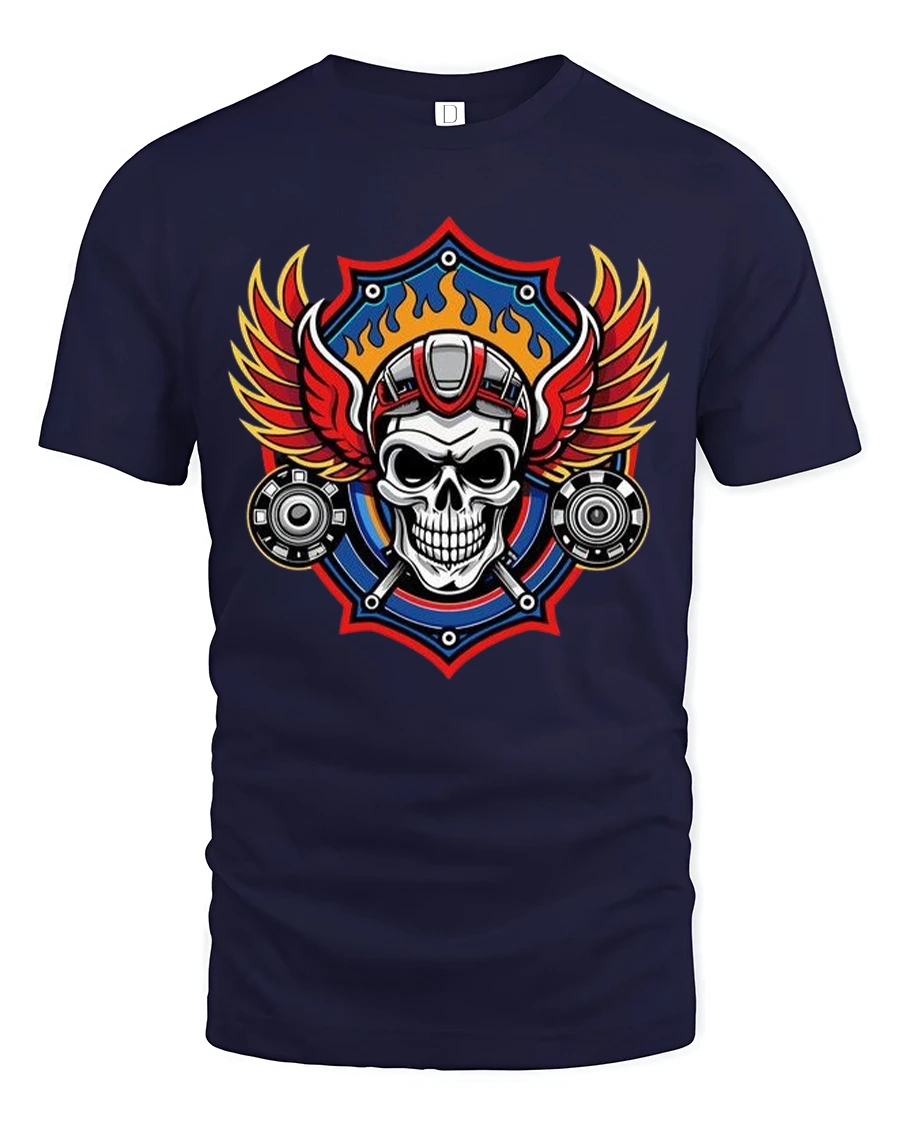 Winged Biker Skull Pistons Flame Emblem Graphic T-Shirt Tee delivers a powerful and striking design made for fans of motorcycle culture, bold artwork, and adrenaline-fueled style. The graphic features a fierce skull wearing a helmet, surrounded by flaming wings and crossed pistons set against a vibrant shield emblem. With its vivid colors and dynamic composition, this tee embodies the freedom, spirit, and edge that bikers love.