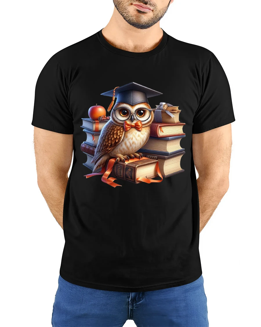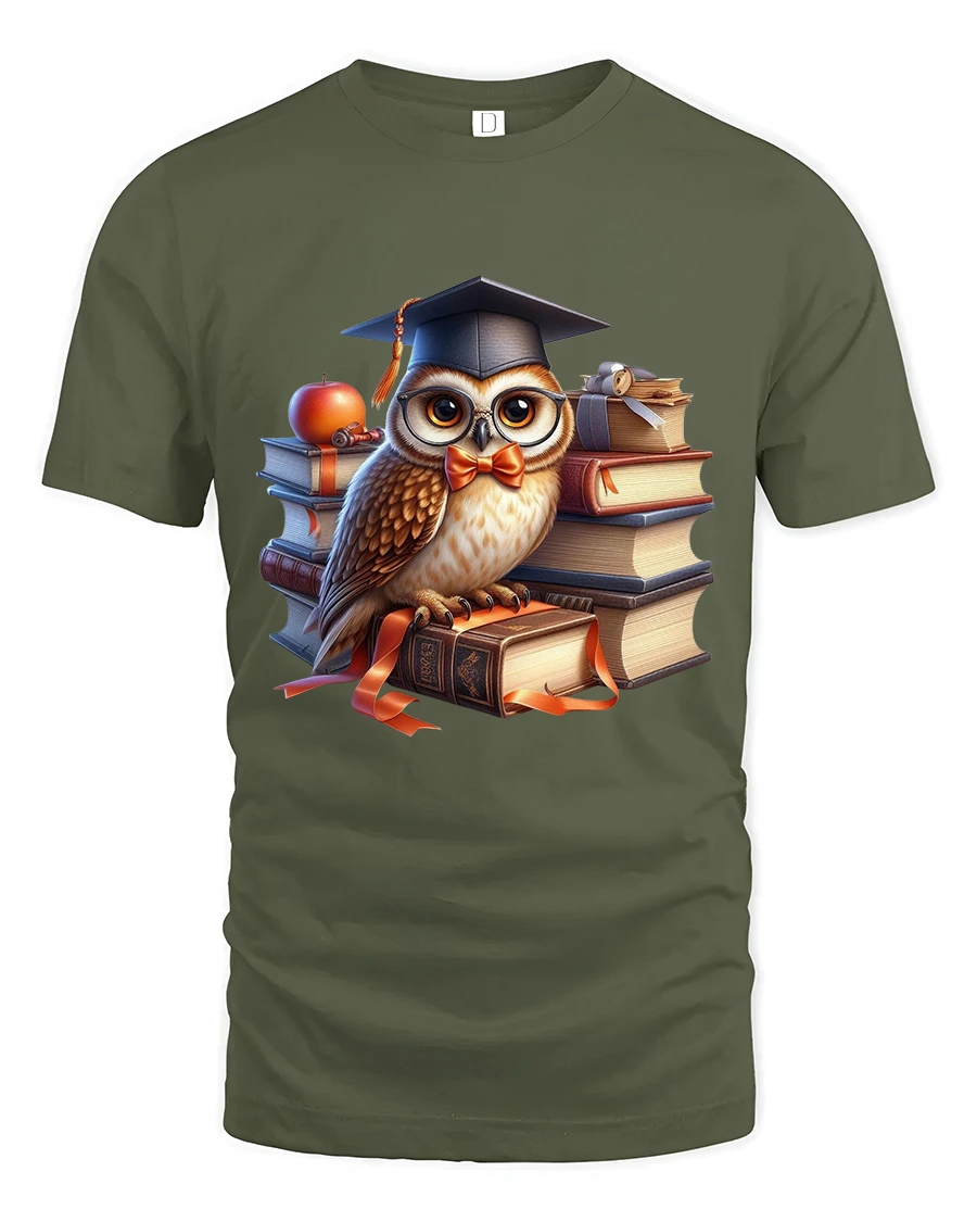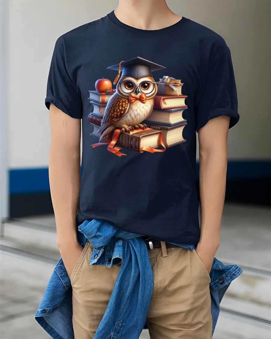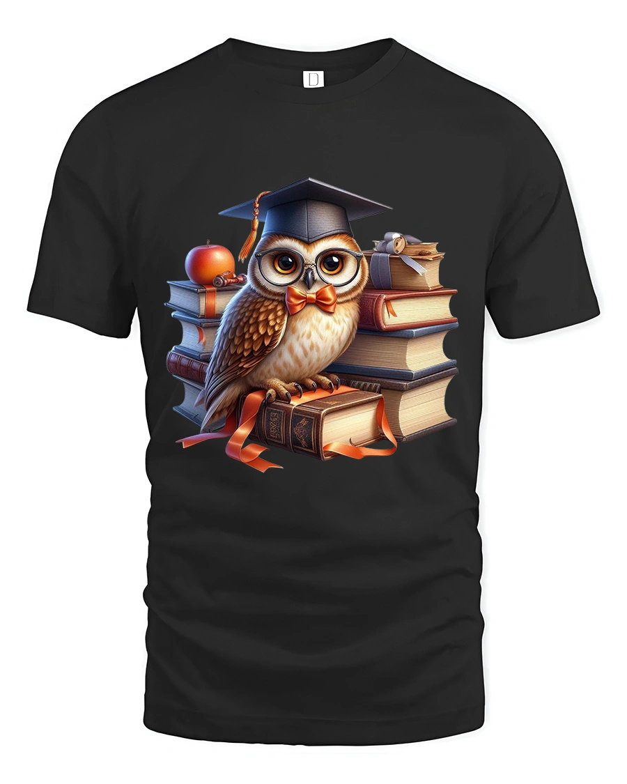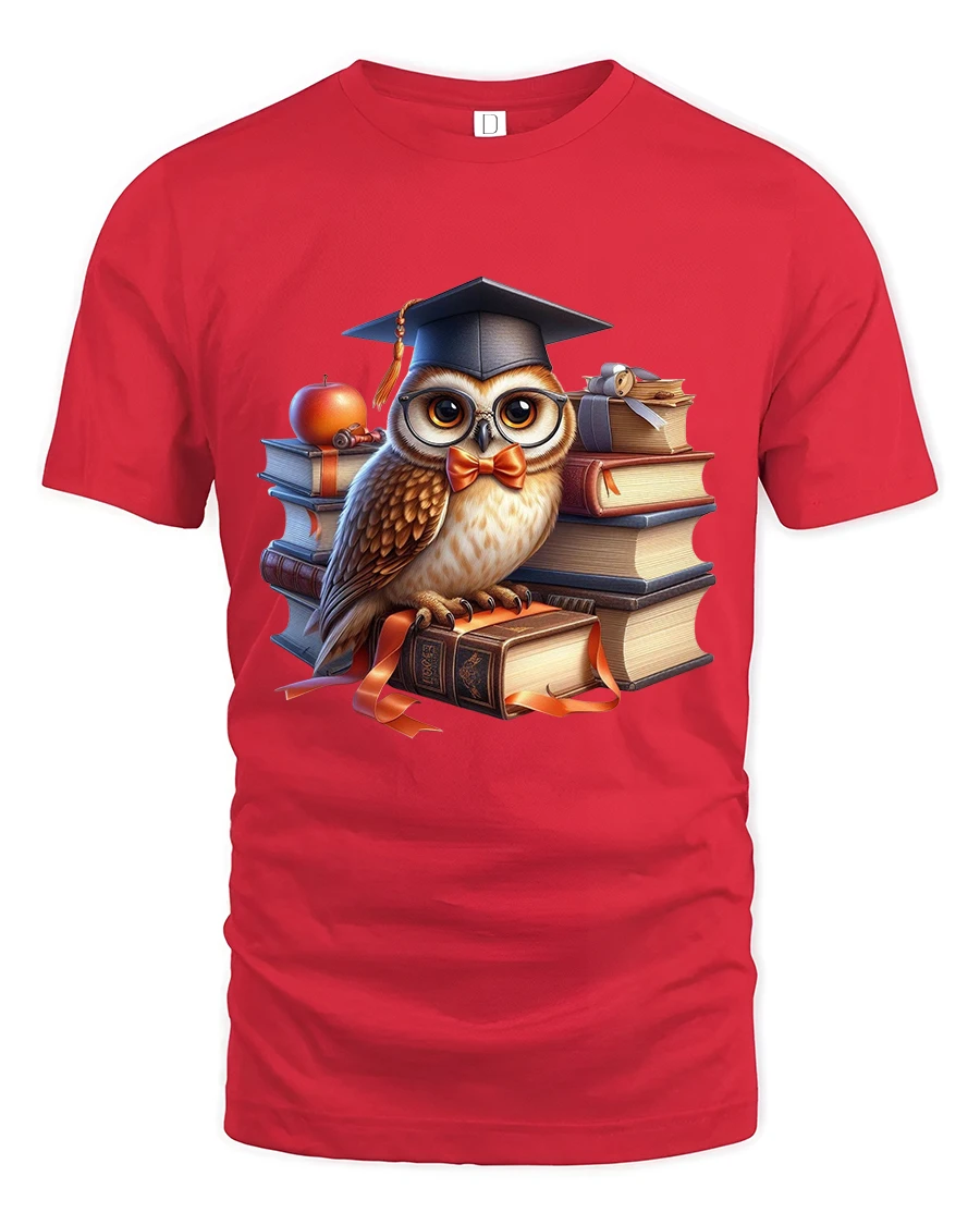Made from soft, breathable cotton, this t-shirt provides lasting comfort for everyday wear. The high-quality print showcases every detail of the owl and books in bright, durable color that stays vivid wash after wash. Ideal for school events, graduations, or simply expressing your love for education.
