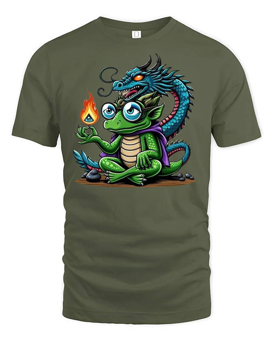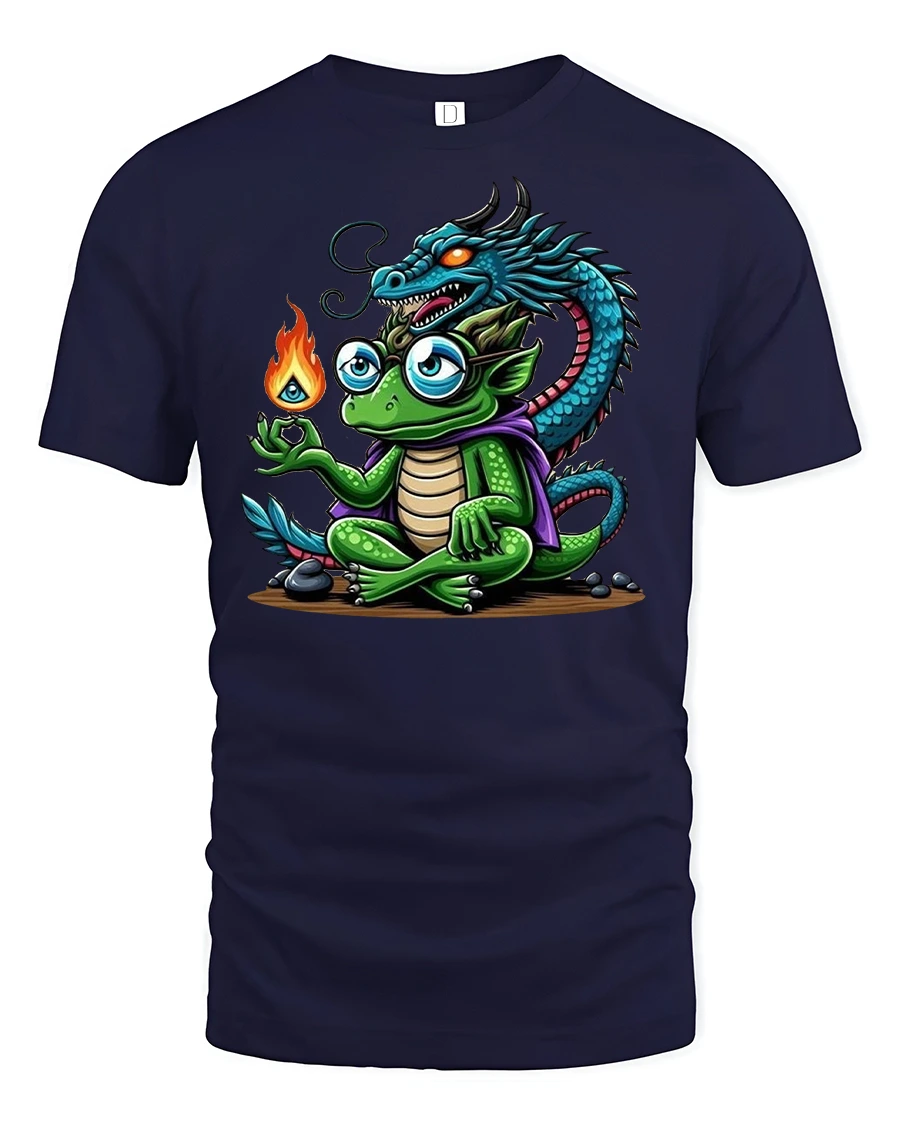 Featuring an adorable green dragon sitting in meditation while holding a small flame, this design perfectly blends fantasy art and humor.